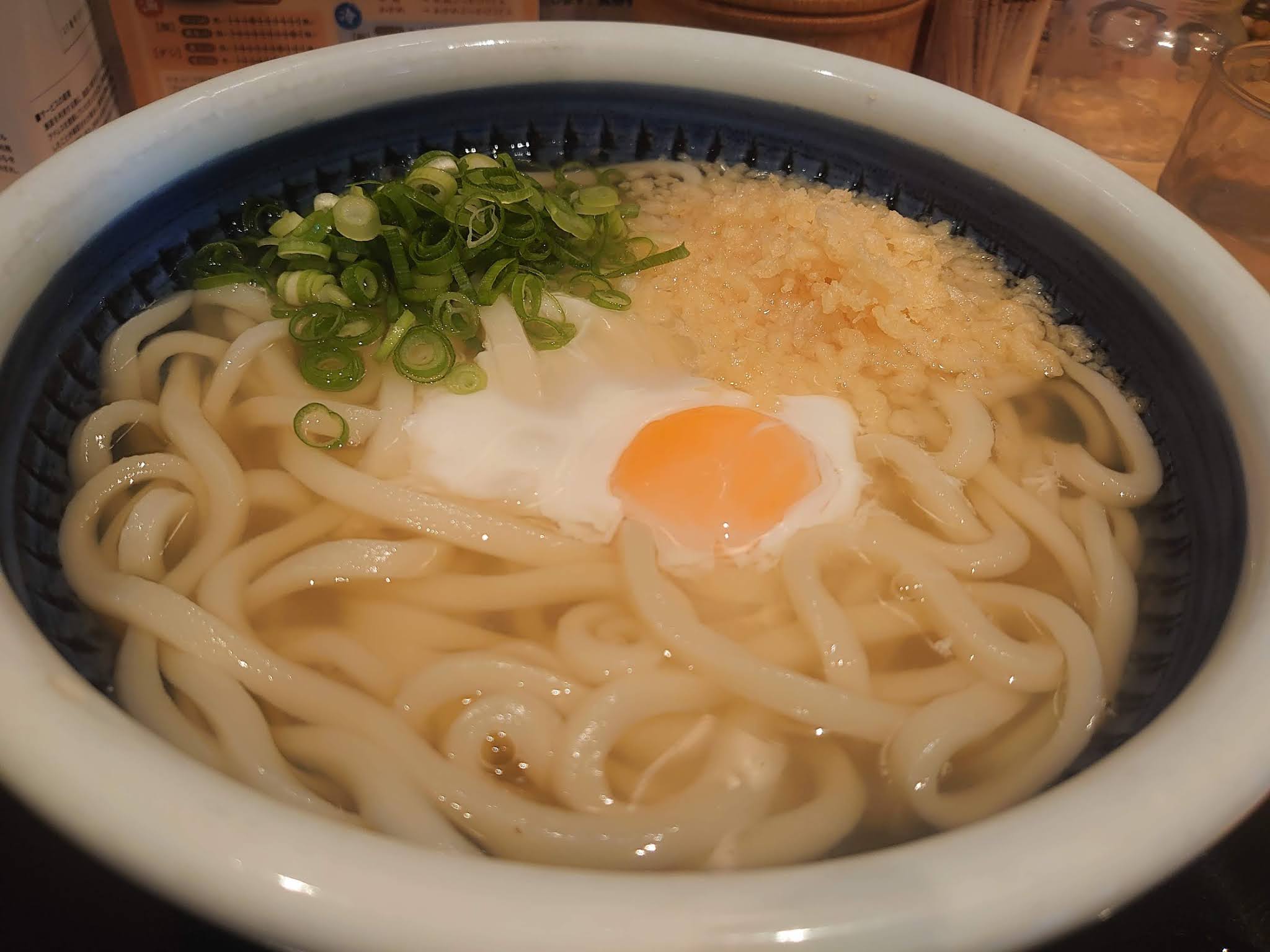 月見うどん(500円)+大盛(100円)+かしわ天(4個)(200円)。温のかけなら月見うどんかな。