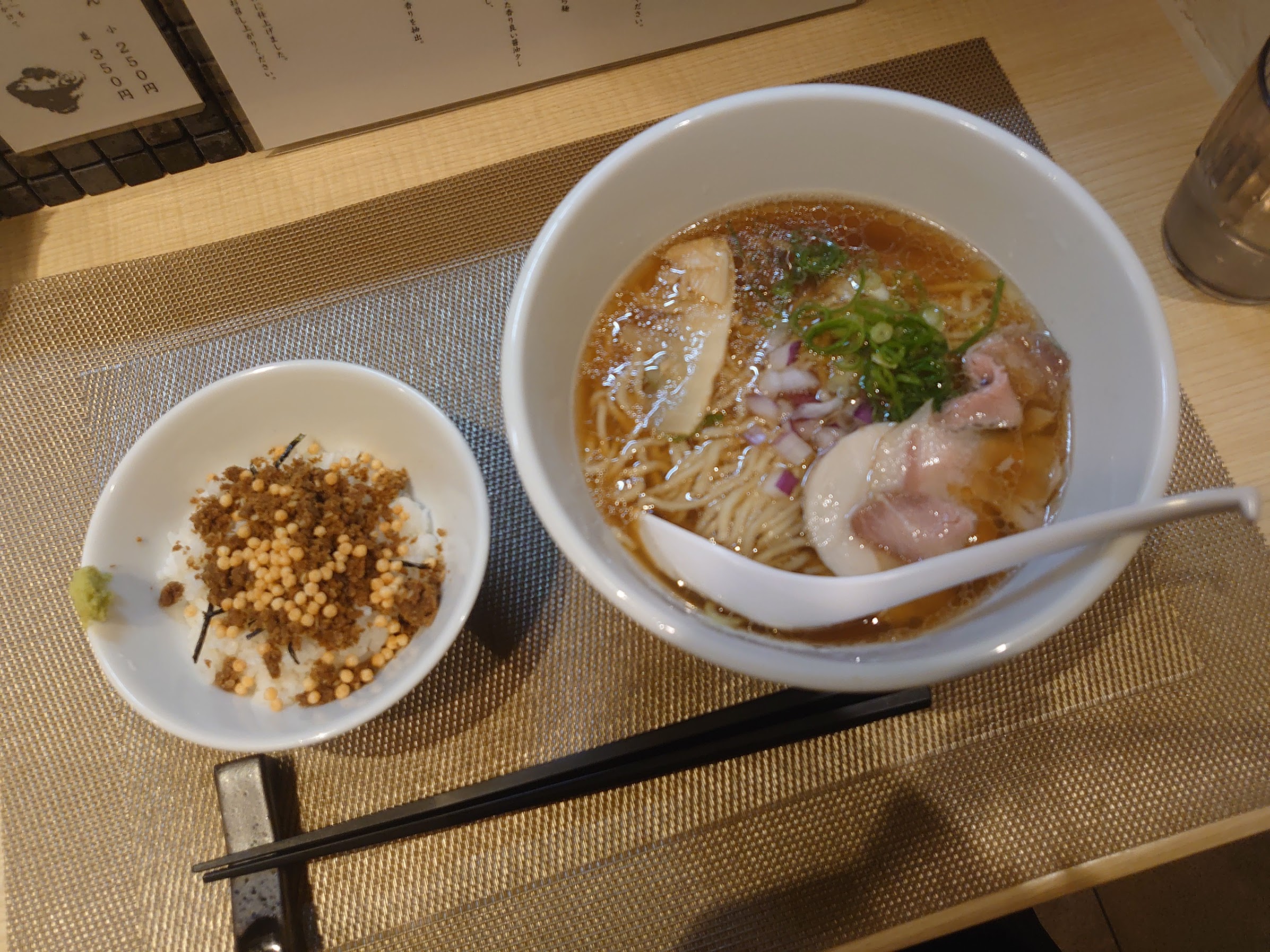蛤と京鰹らぁ麺(醤油)と鰹の佃煮ごはん(小)セット(1130円)。